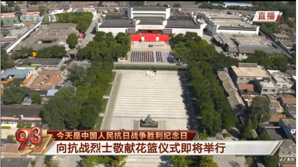中共中央、全国人大常委会委员会、国务院、全国政协、中央军委和抗战老战士老同志、首都各界群众分别敬献的7个花篮一字排开,摆放在纪念馆前平台上?;ɡ旱暮焐写闲醋拧霸谥泄嗣窨谷照秸杏⒂挛牧沂棵怯来共恍唷?。