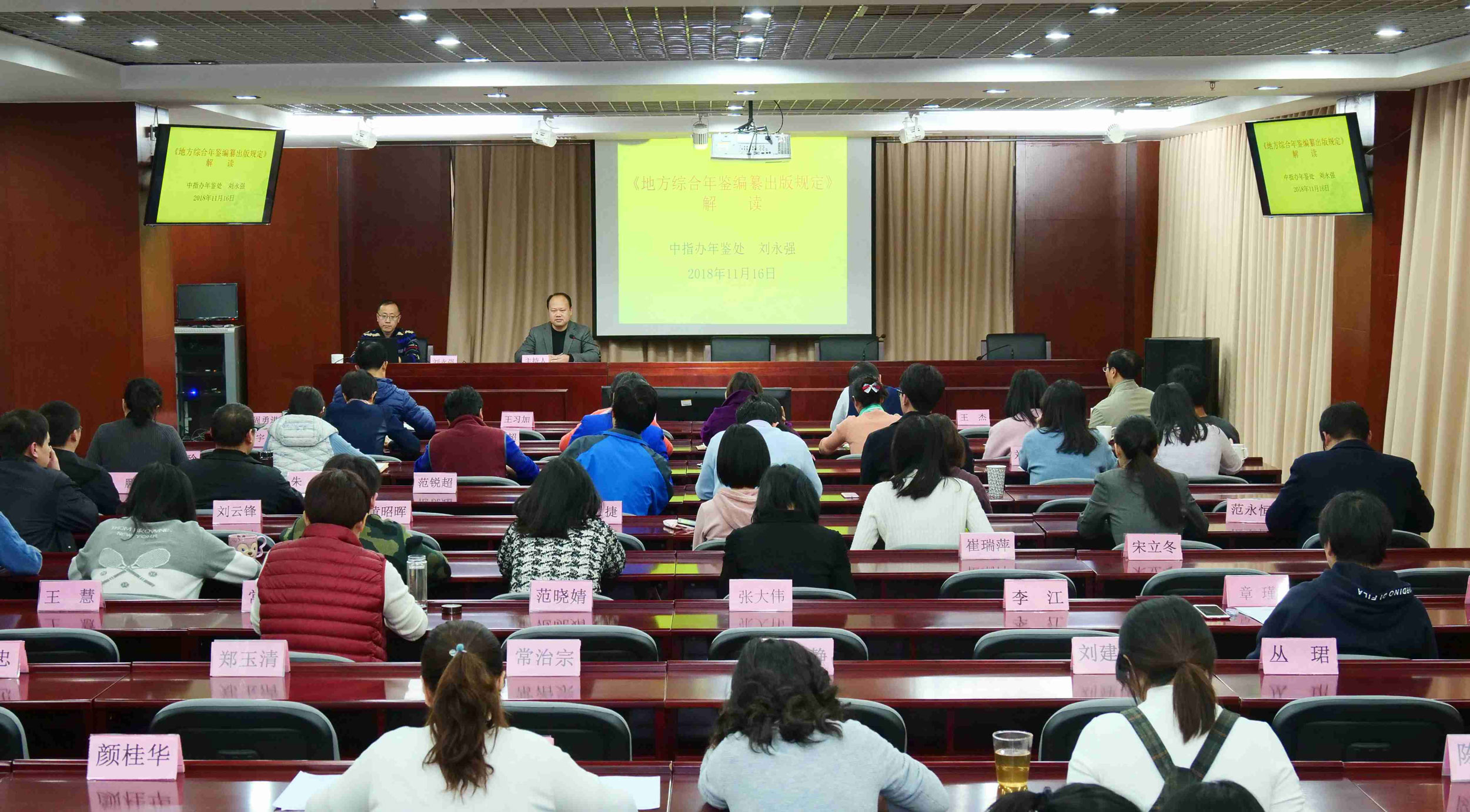 2018年11月16日下午,由中国地方志指导小组办公室(以下简称中指办)主办的“方志大讲堂”第十九讲在国家方志馆一楼学术报告厅举行。中指办年鉴处处长、副研究员刘永强主讲,讲座题目为“《地方综合年鉴编纂出版规定》解读”,中指办科研处副处长、副研究员周勇进主持讲座并点评。